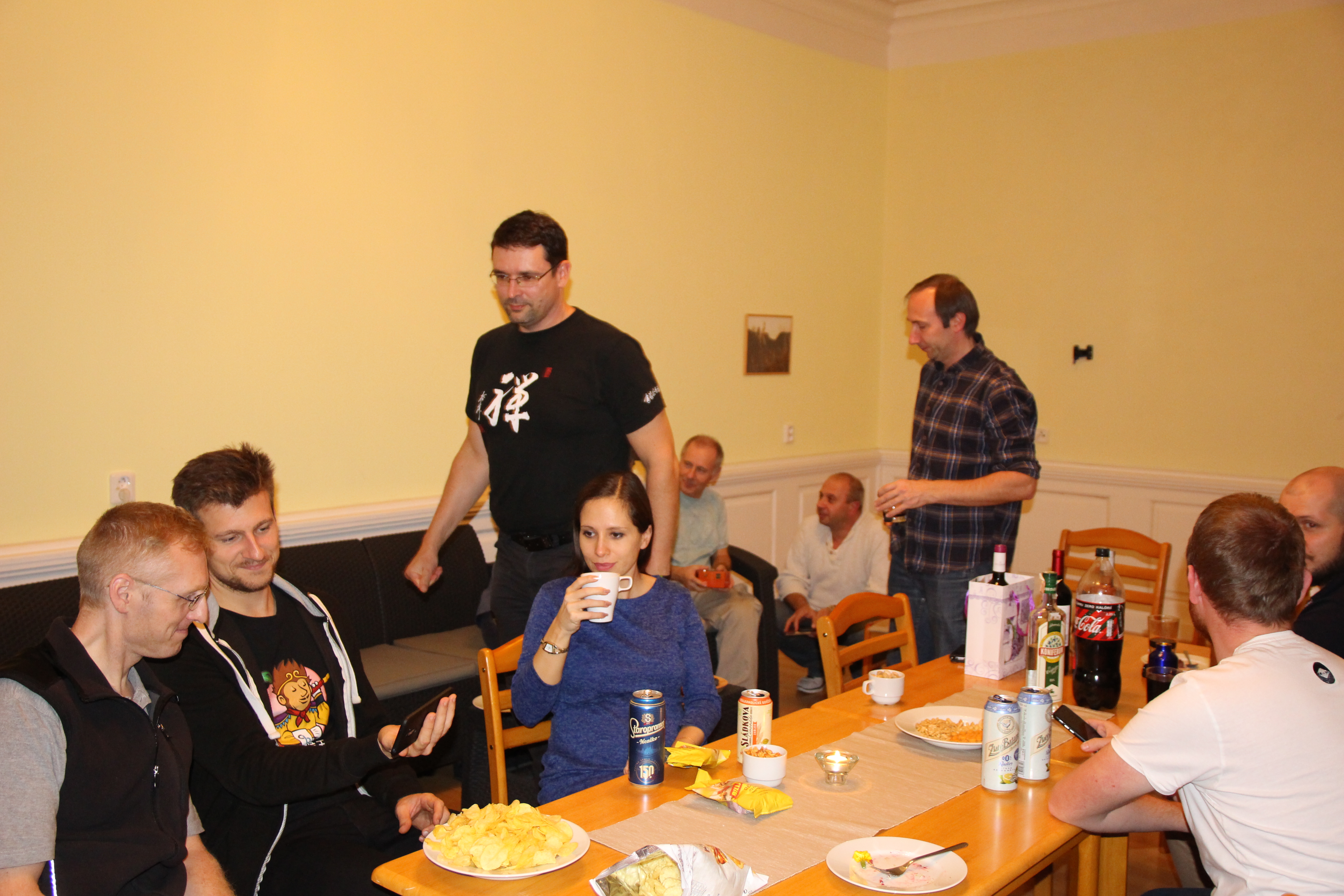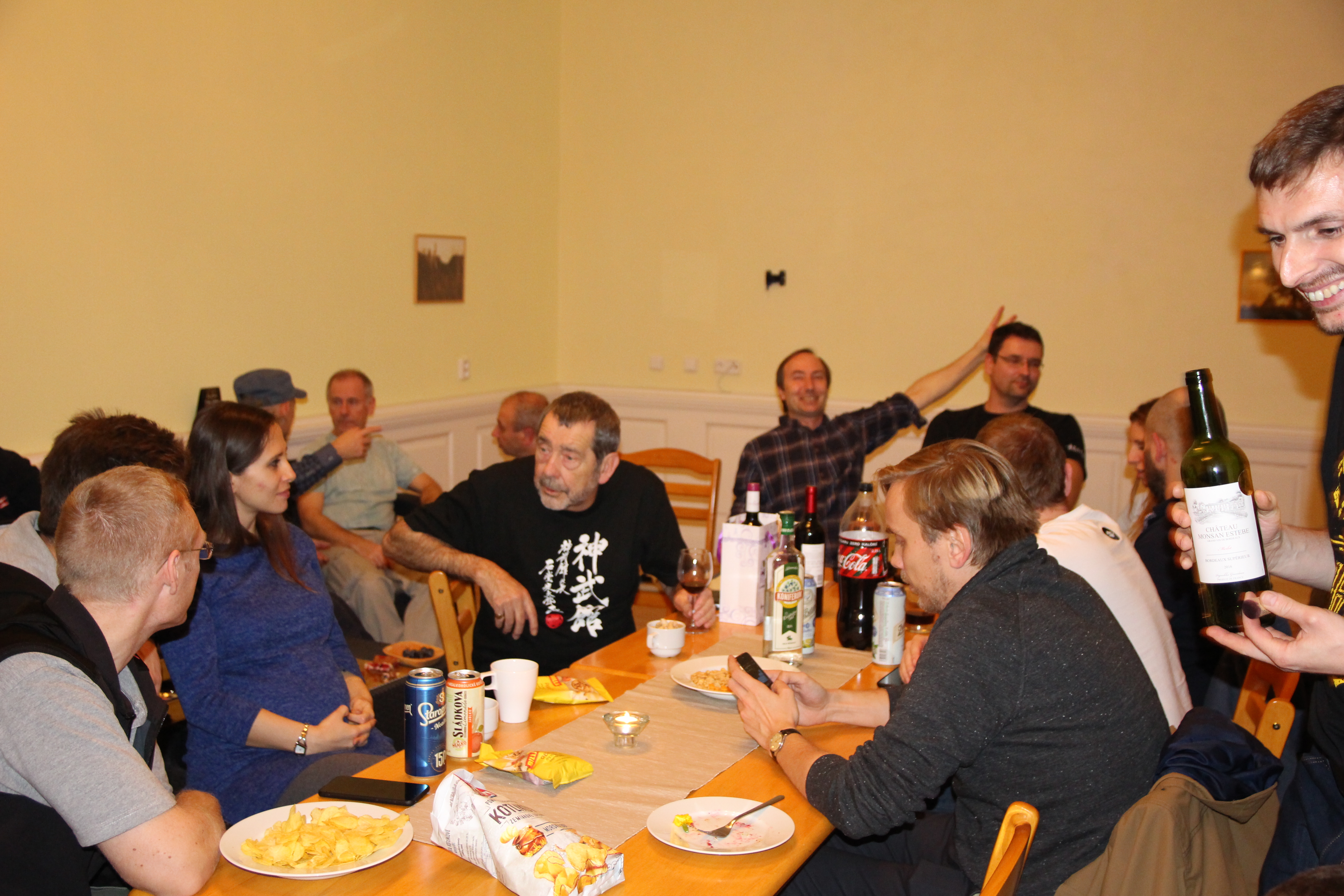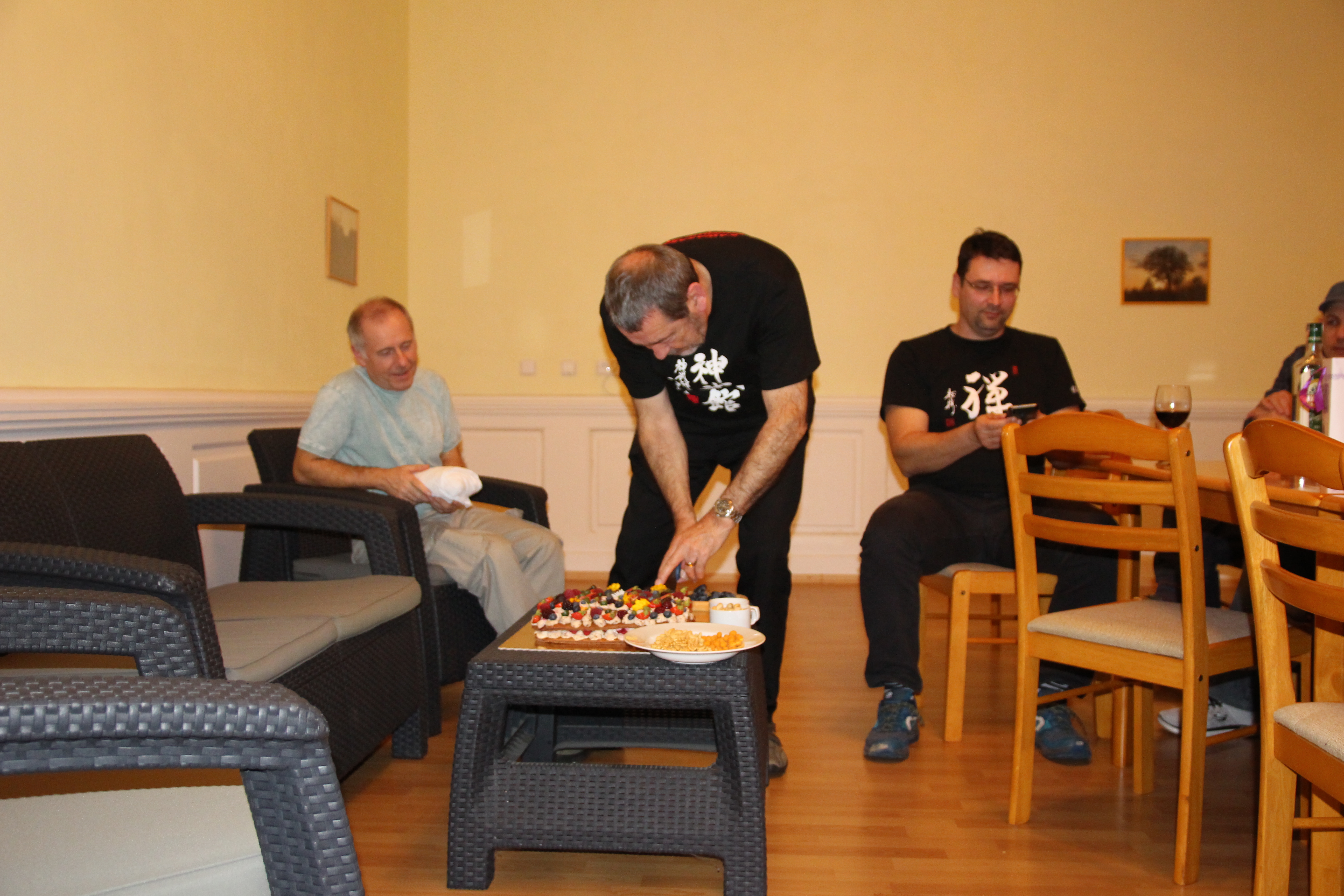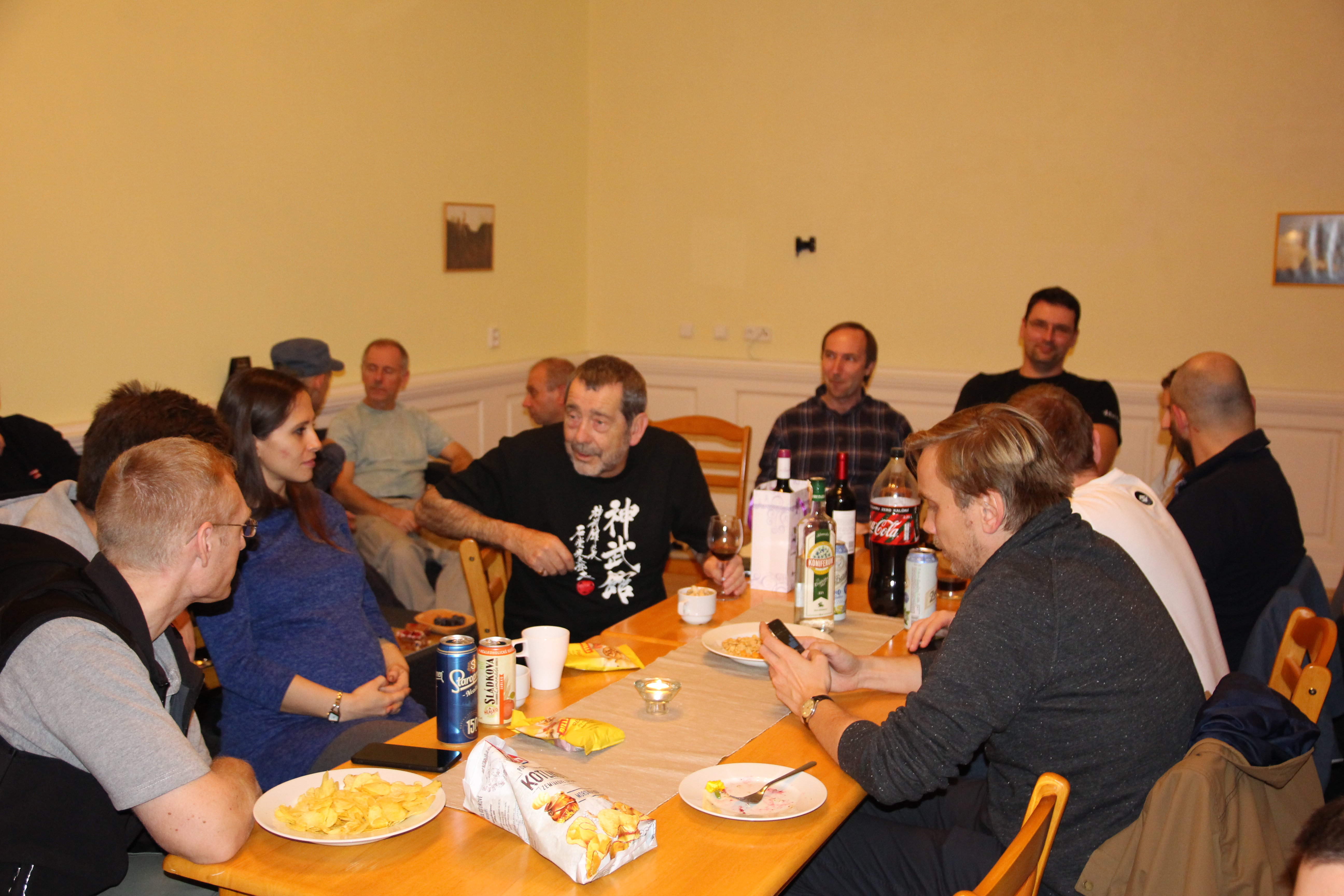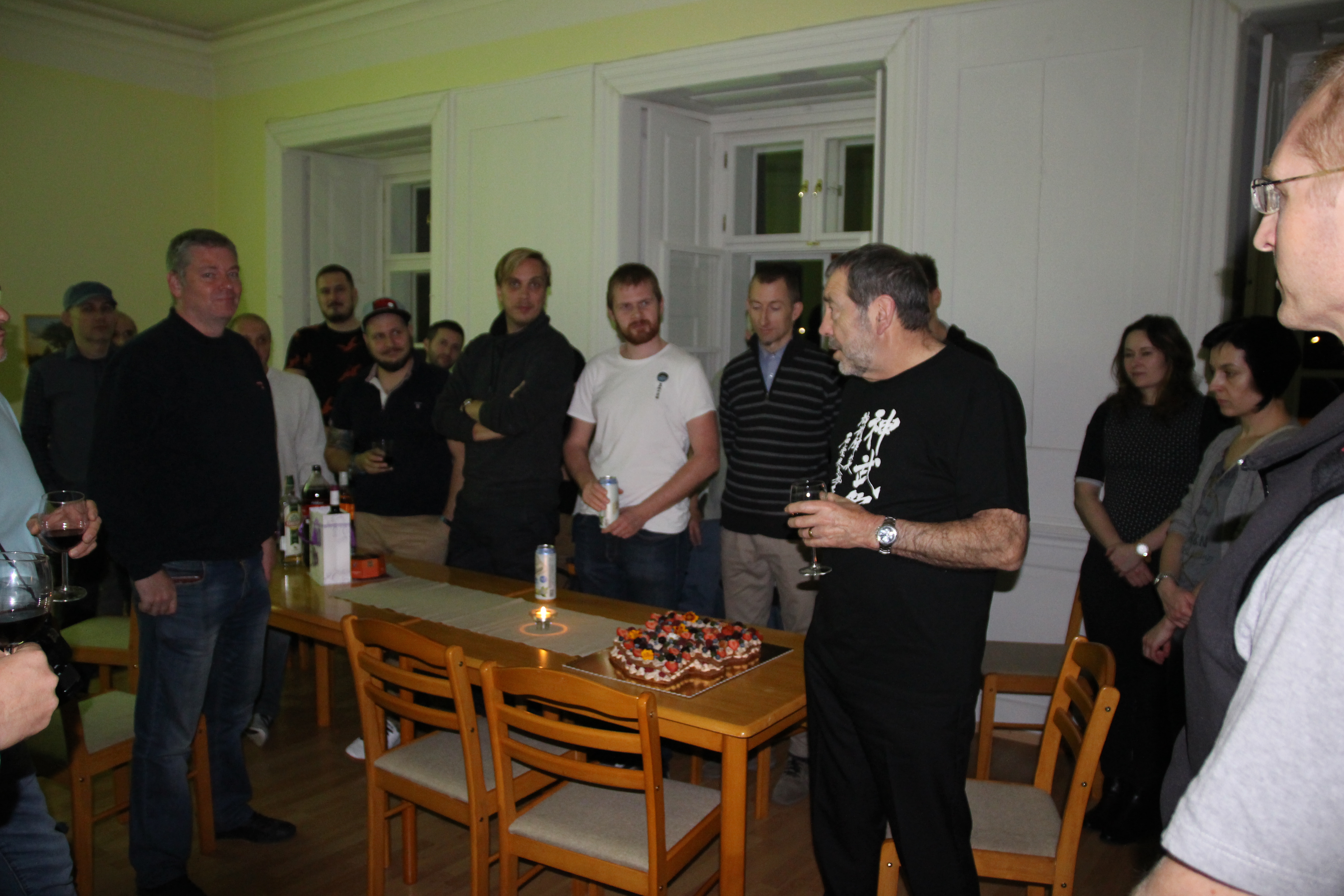 Večer proběhla oslava 40 let Shinbukanu v Evropě. Sensei dostal krásný dort a vzpomínkovou knihu plnou fotografií mapující jeho život v dojo. U mnoha fotek sensei vzpomínal na okamžik jejich pořízení či přidal k dobru příhodu. Věřím, že jej to velmi potěšilo. Akce se postupně uvolnila a ani alkohol nezůstal stranou.