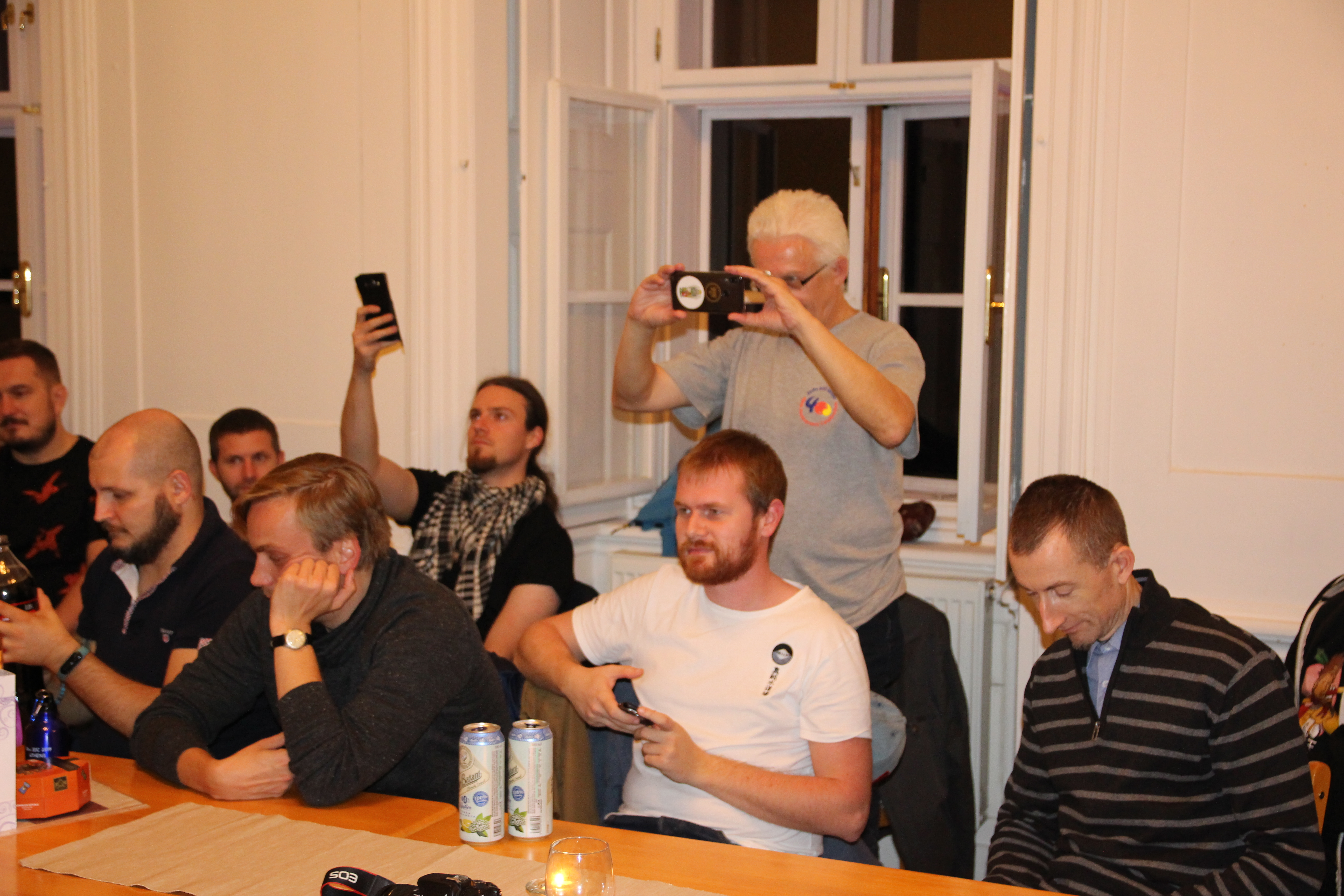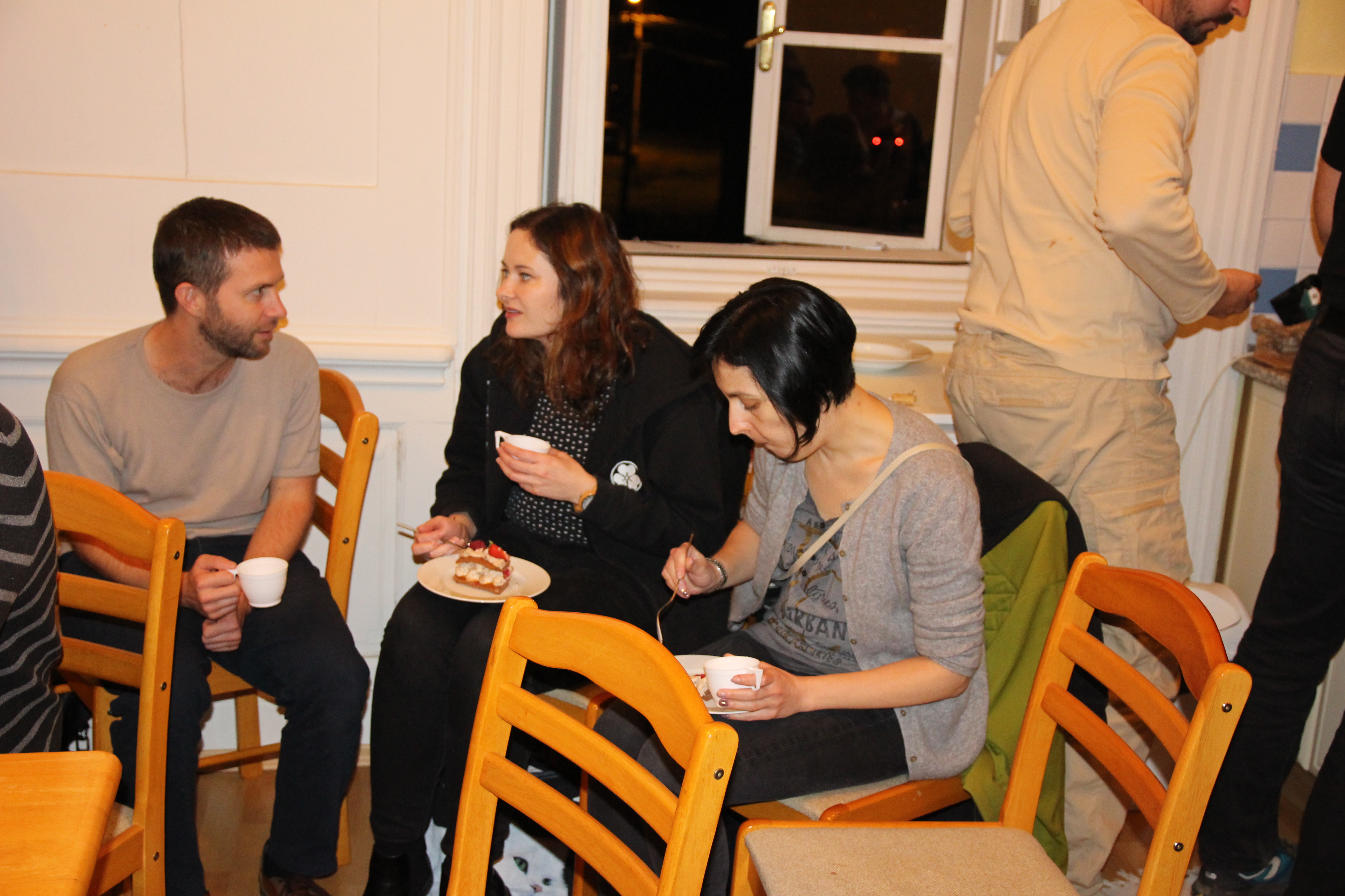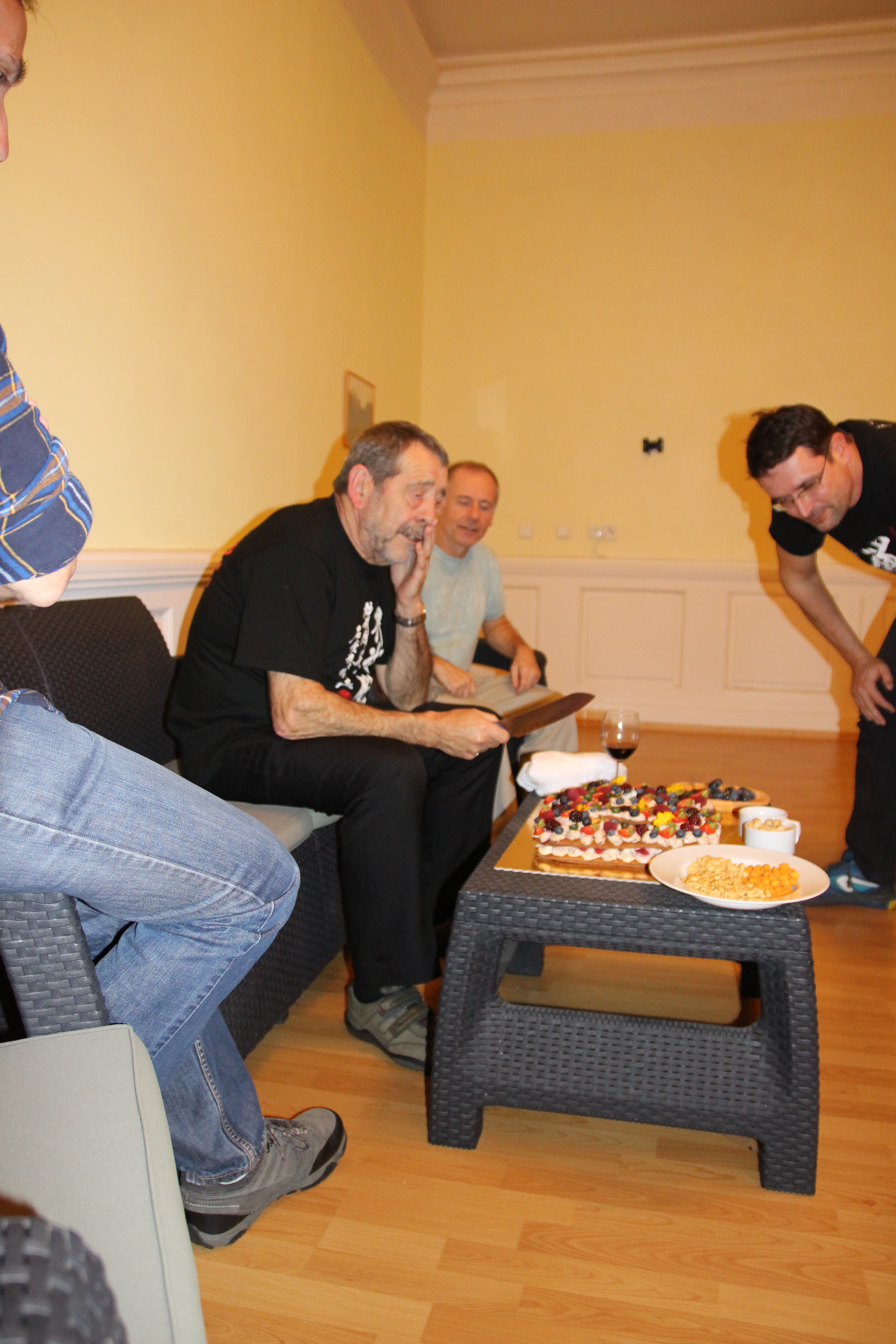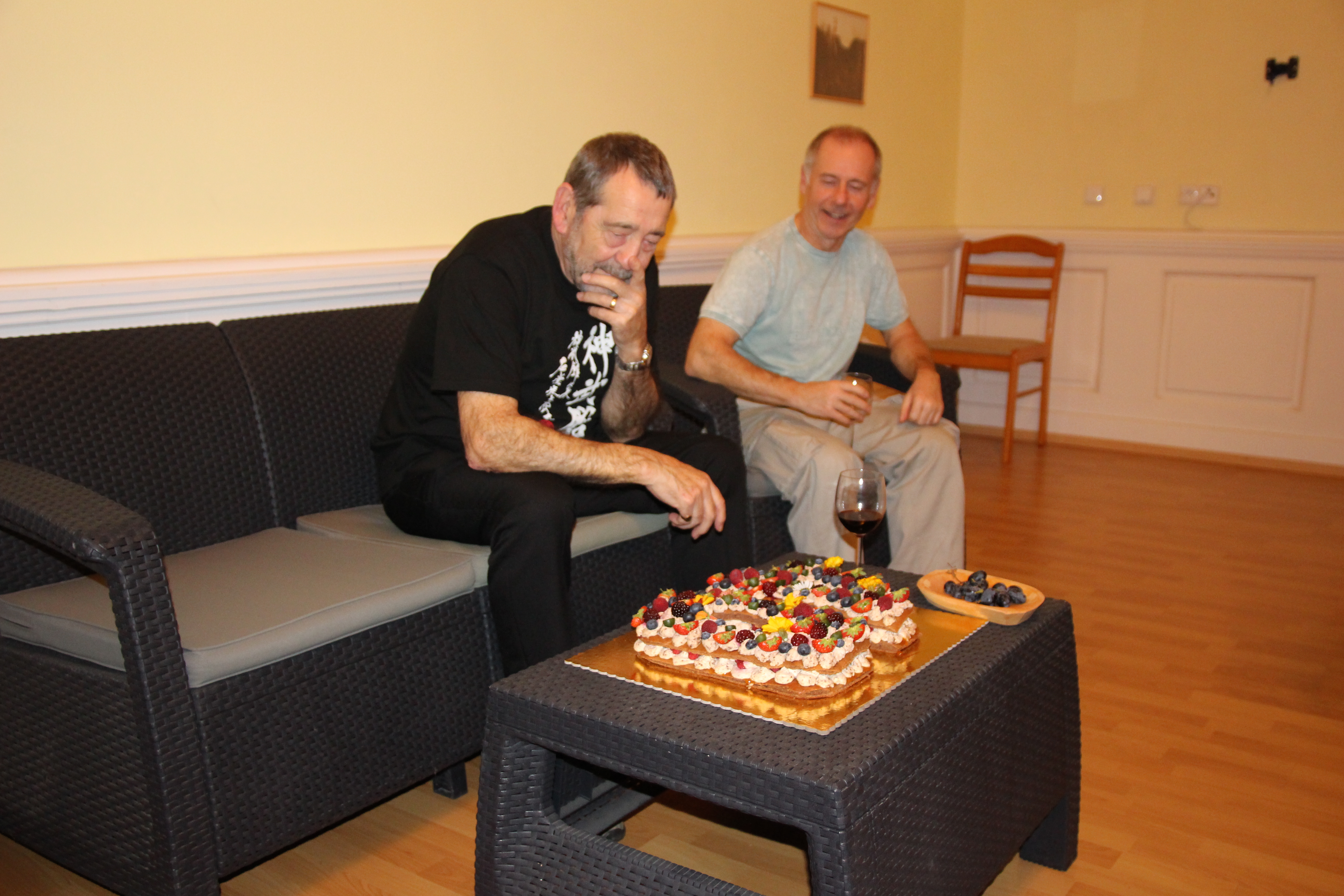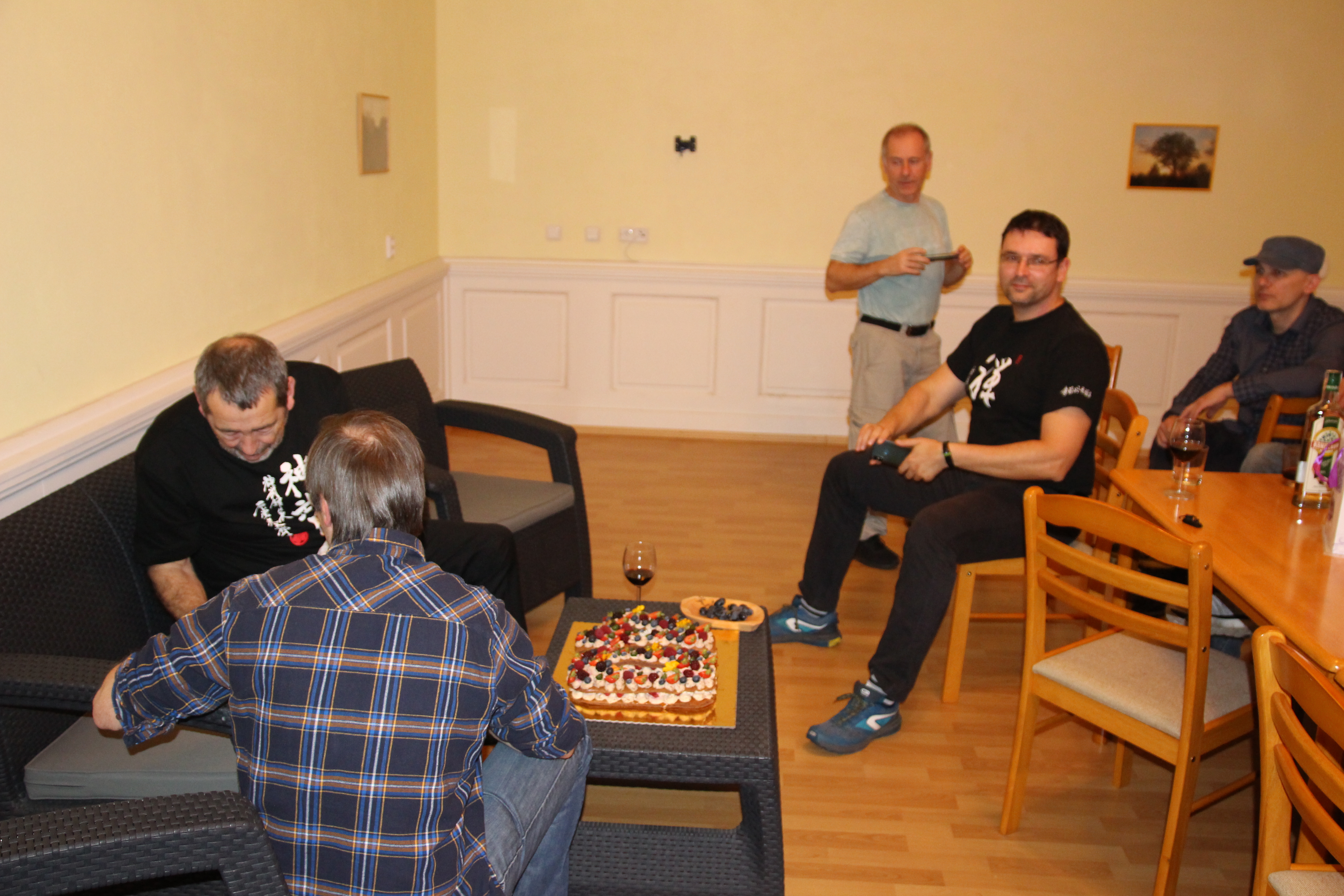 Večer proběhla oslava 40 let Shinbukanu v Evropě. Sensei dostal krásný dort a vzpomínkovou knihu plnou fotografií mapující jeho život v dojo. U mnoha fotek sensei vzpomínal na okamžik jejich pořízení či přidal k dobru příhodu. Věřím, že jej to velmi potěšilo. Akce se postupně uvolnila a ani alkohol nezůstal stranou.