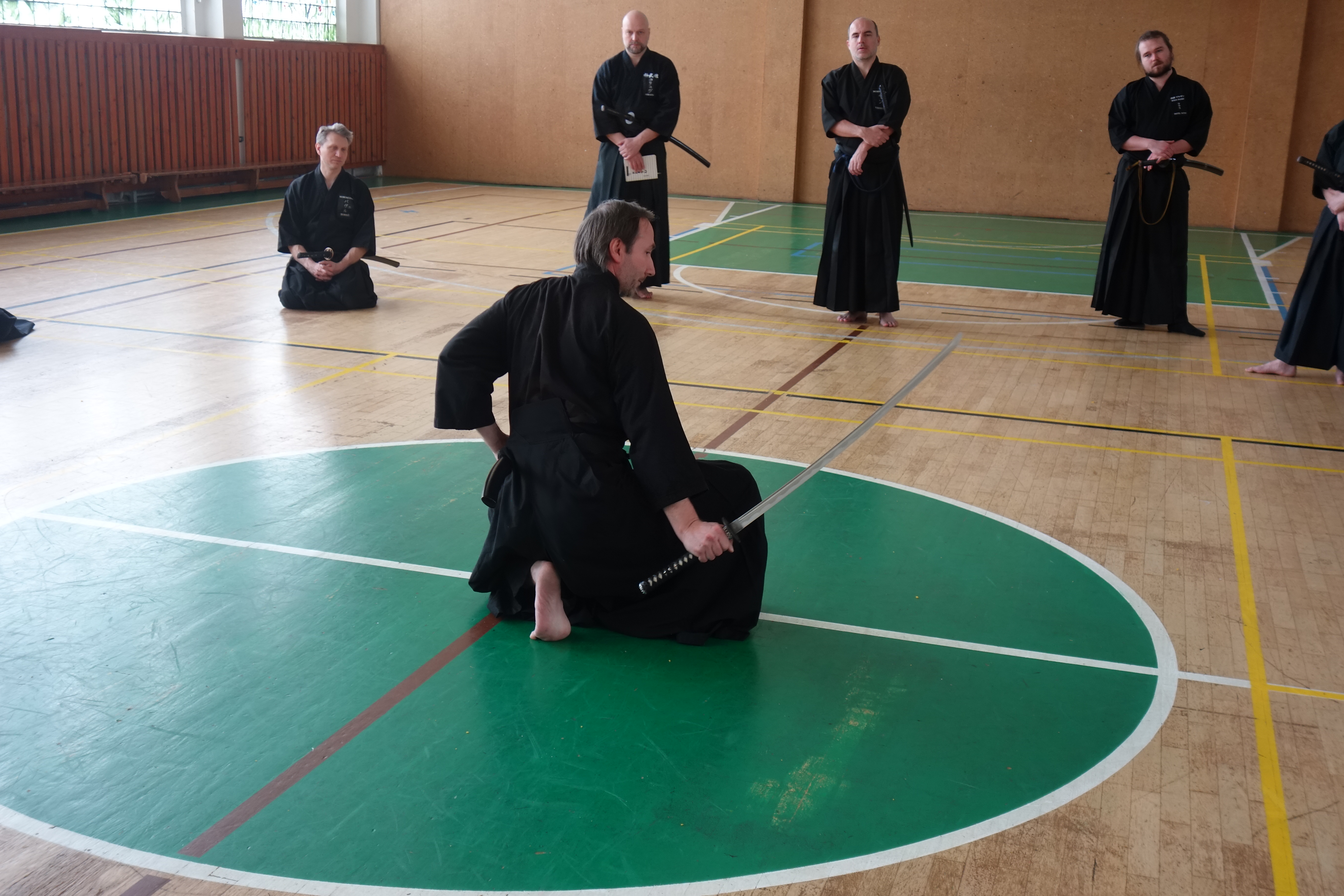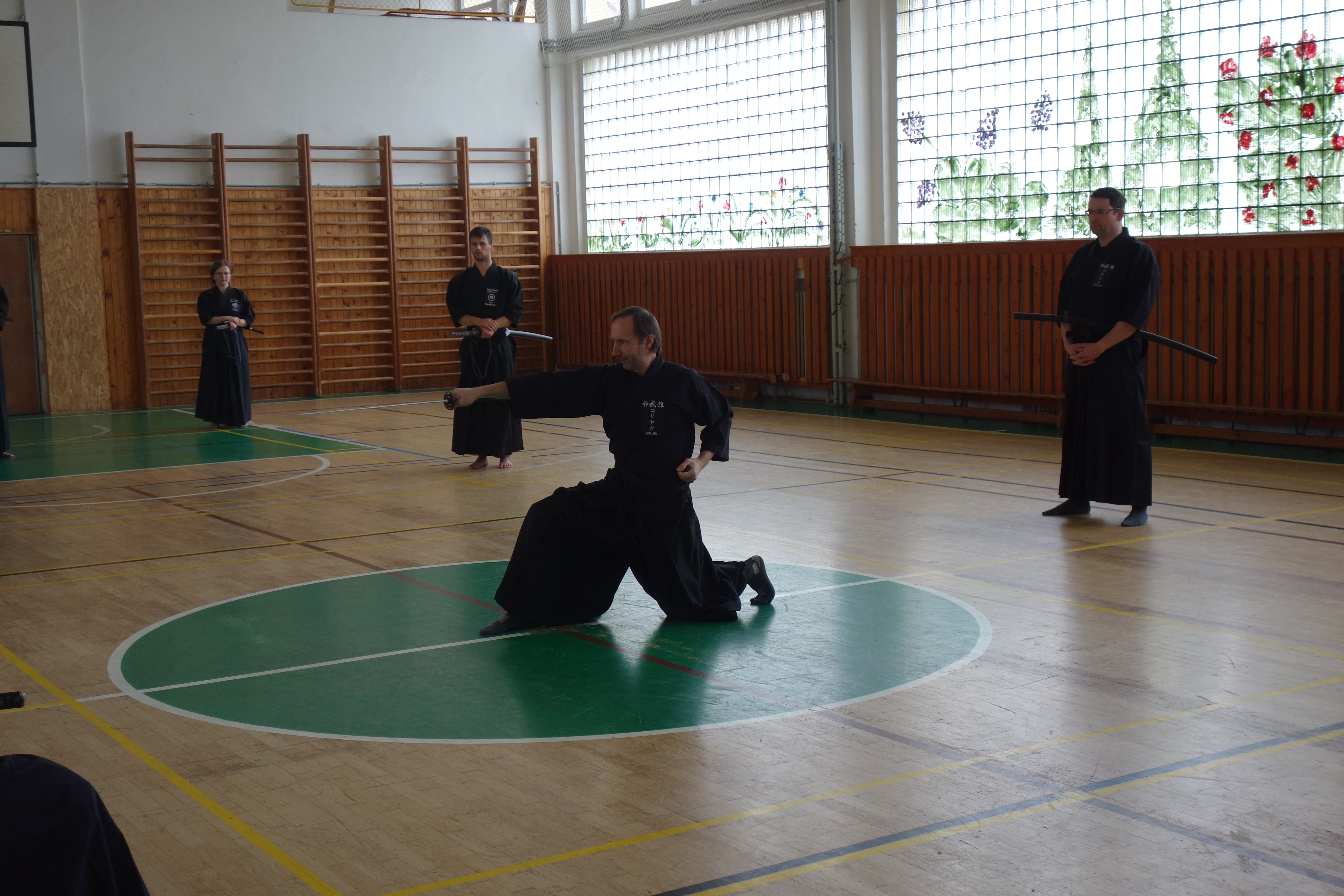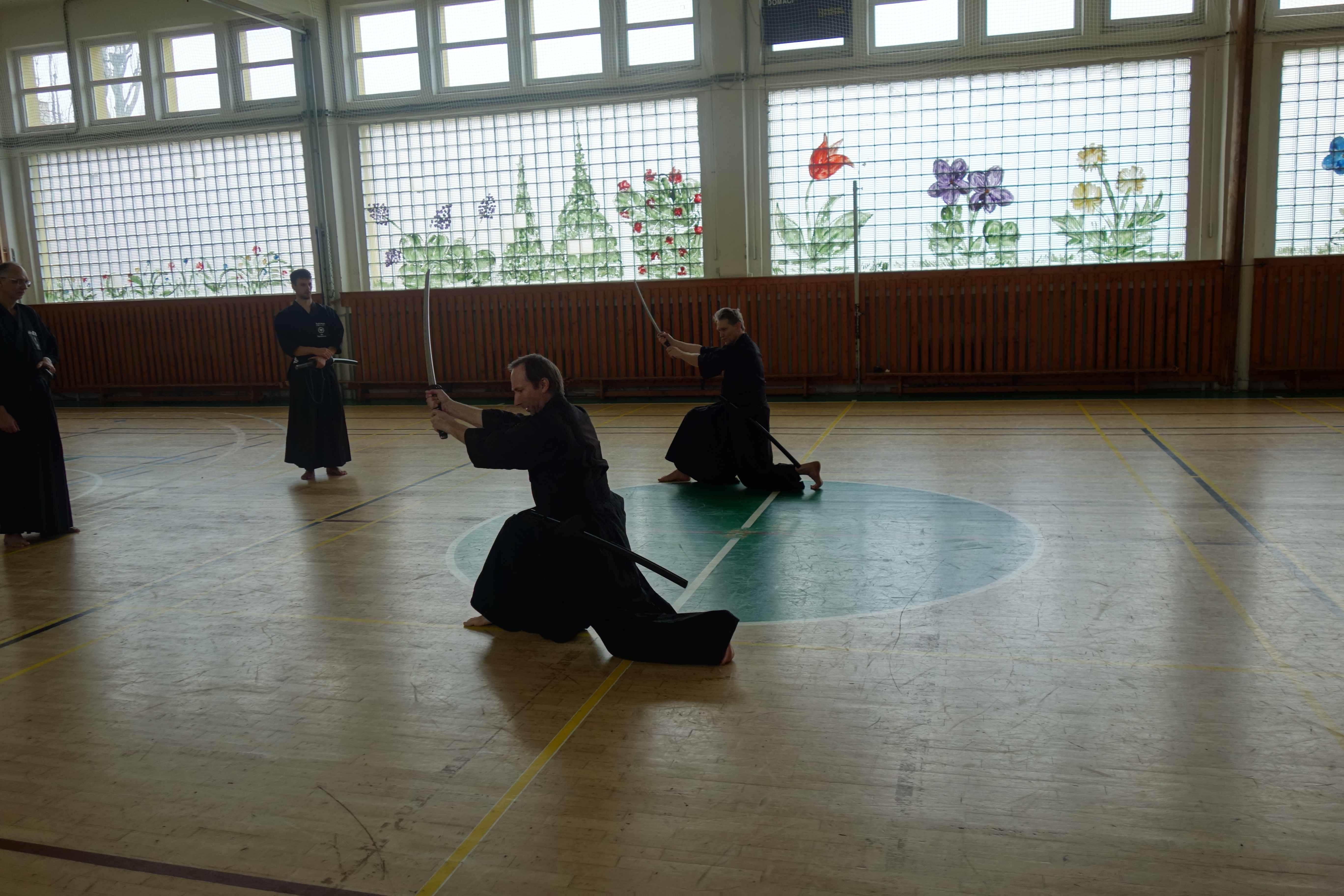 Trénink jsme započali rozcvičkou, která měla za cíl uvolnit svaly a protáhnout šlachy, často velmi oslabené sedavou prací. Následovalo zopakování šesti kata, které byly probrané na předchozím semináři. Nebylo opomenu to ani přiblížení koryu reiho a formálních rozdílů oproti Seitei iai. Každou opakovanou katu jsme nejprve zacvičili a následně byly při chudo popsány nejčastější chyby a nedostatky, nebo bylo stanoveno, jaká varianta je brána jako základ (kihon) a co jsou vybrané u nás cvičené kaewaza. Kromě toho Pavel Tomeš představil u některých technik i provedení odpovídající jejich linii, což bylo velmi zajímavé.