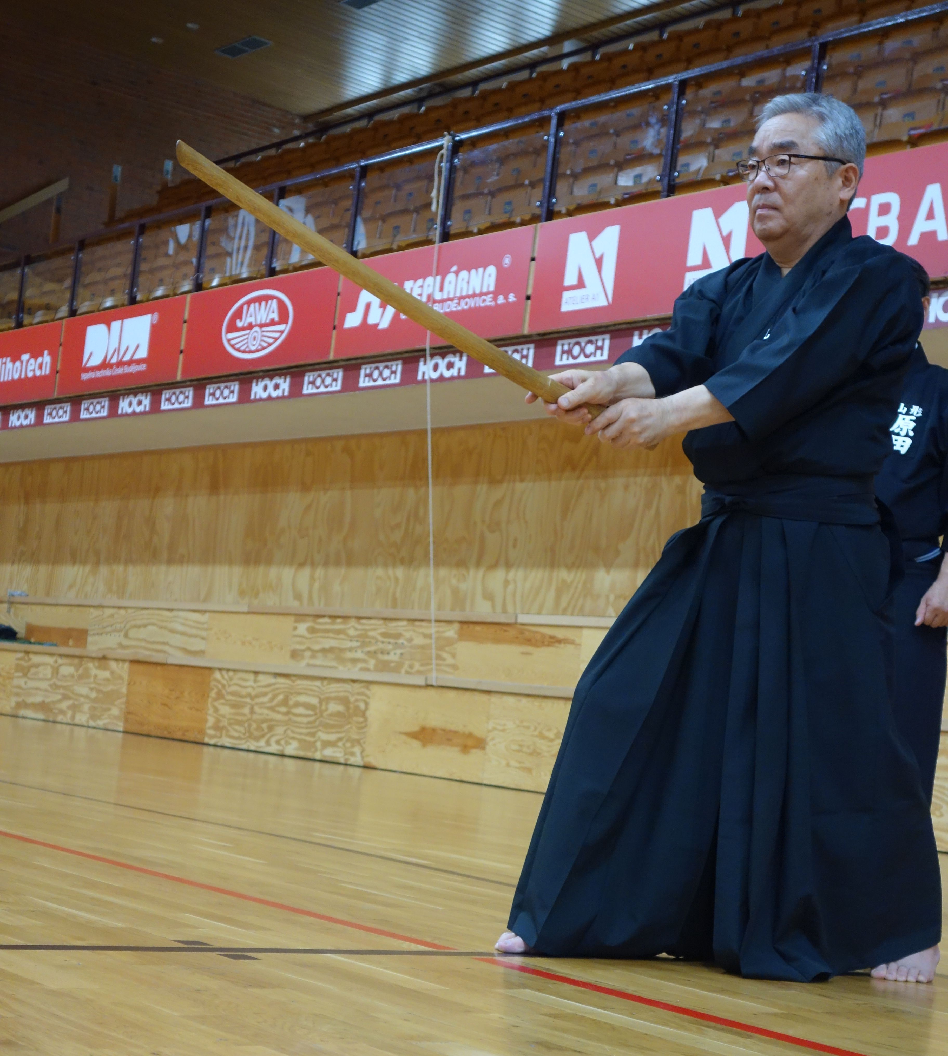 Po společném úvodu a opakování předchozích technik jsme pokročili dále – s tím se pojila i změna učitele u naší skupiny. Tentokrát se nám věnoval pan Harada Shigehiro. Jeho výuka byla koncipována jinak. Po ukázce konkrétní techniky, kdy nám vysvětlil, v čem u ní spočívá zakopaný pes, jsme se snažili procvičovat daný prvek. Pan Harada Shigehiro je opravdu skvělý učitel, což dokázal i tím, že i přes jazykový blok nám bylo většinou zcela jasné, co nám ukazuje nebo vysvětluje. Velmi dobře dokázal cvičením vyjádřit rozdíl, který nastane, pokud se (ne)použije některá drobnost správně, nebo není vhodně použito časování či ki ken tai no ichi…